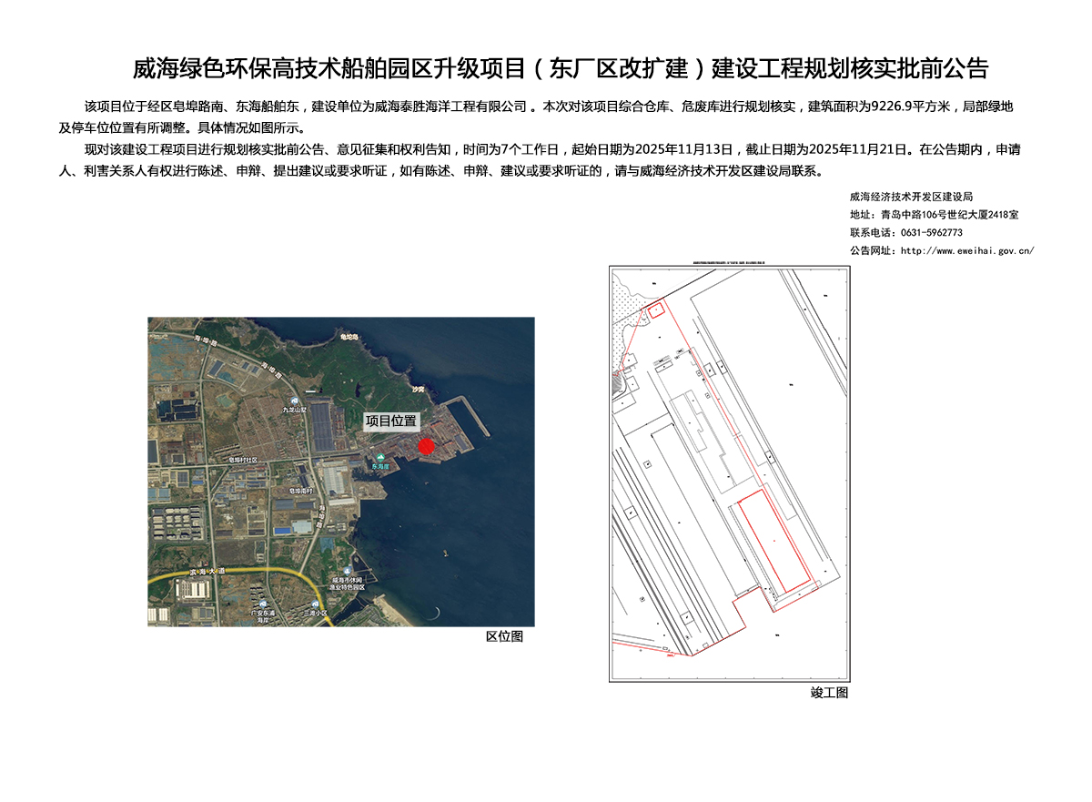 威海绿色环保高技术船舶园区升级项目(东厂区改扩建)建设工程竣工规划核实批前公告